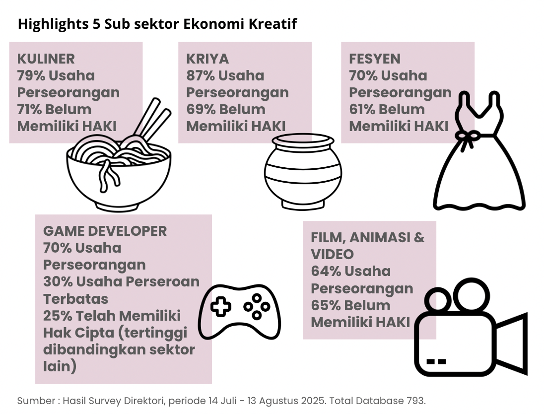 Creative economy actors are those who (1) possess a brand identity and (2) have the potential to secure Intellectual Property (IP) rights. The distinguishing feature lies in their creative distinctiveness — an asset that can generate added value, regardless of whether the IP is formally registered.