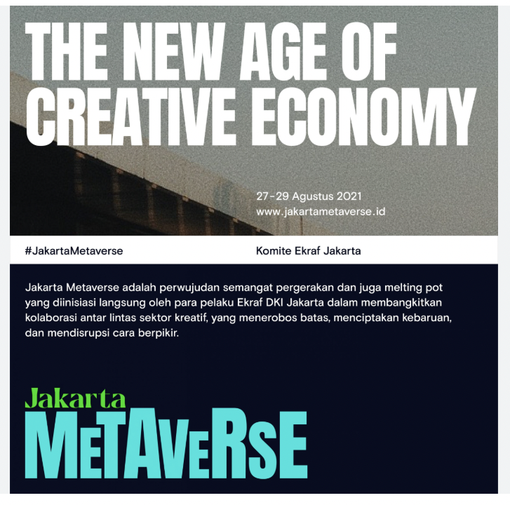 Jakarta Metaverse was a pioneering digital movement and melting pot for Jakarta’s creative economy players. Held online from 27–29 August 2021, the event was organized by Komite Ekraf Jakarta (KE JKT) under the theme “The New Age of Creative Economy”.